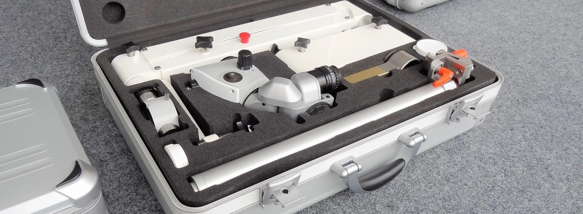 The lightweight microscope can be easily stored in its robust aluminium case with carry-on baggage dimensions. Set up in only 5 minutes without tools, it is ideal for mobile use. The floor stand can also be quickly disassembled into its individual components and transported conveniently.